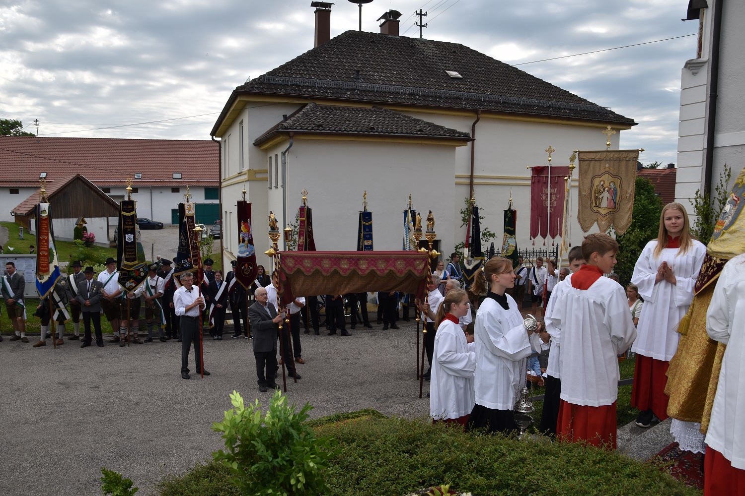 Nach dem Hochamt, zelebriert von Offizialatsrat Joachim Kunz, wurde das Allerheiligste durch Baindlkirch getragen, begleitet von den Kommunionkindern, den Fahnenabordnungen der Vereine, dem Kirchenchor Baindlkirch und den Gläubigen.